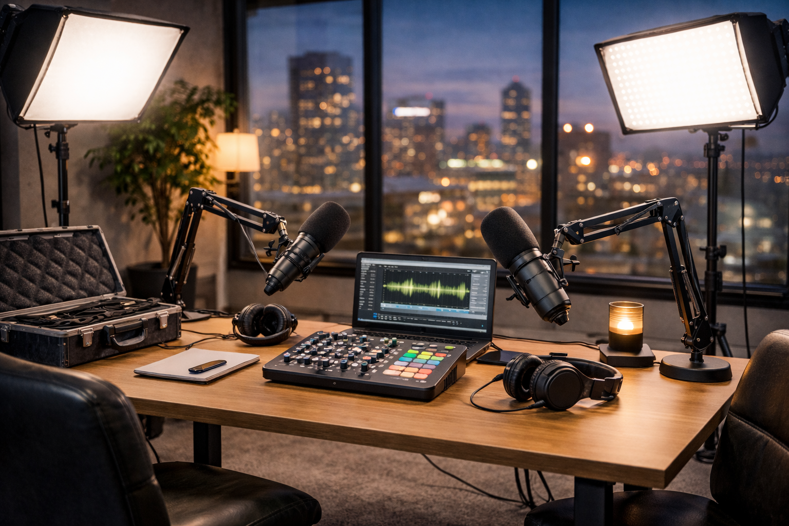 Transform any space into a professional podcast studio with our mobile recording service, complete with microphones, stands, and expert setup. Lighting included. We can help you posting your video podcast in every platform.